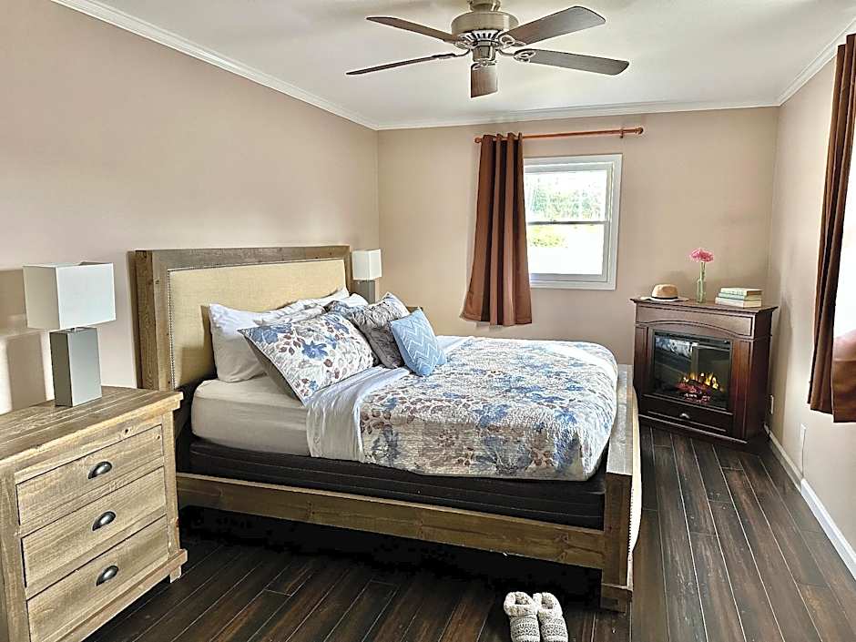 This villa features a seating area with an electric fireplace, a covered front porch and ironing facilities. A small microwave, refrigerator and Keurig® coffeemaker are provided, as is a separate bathroom with a hairdryer. A dining table is included.